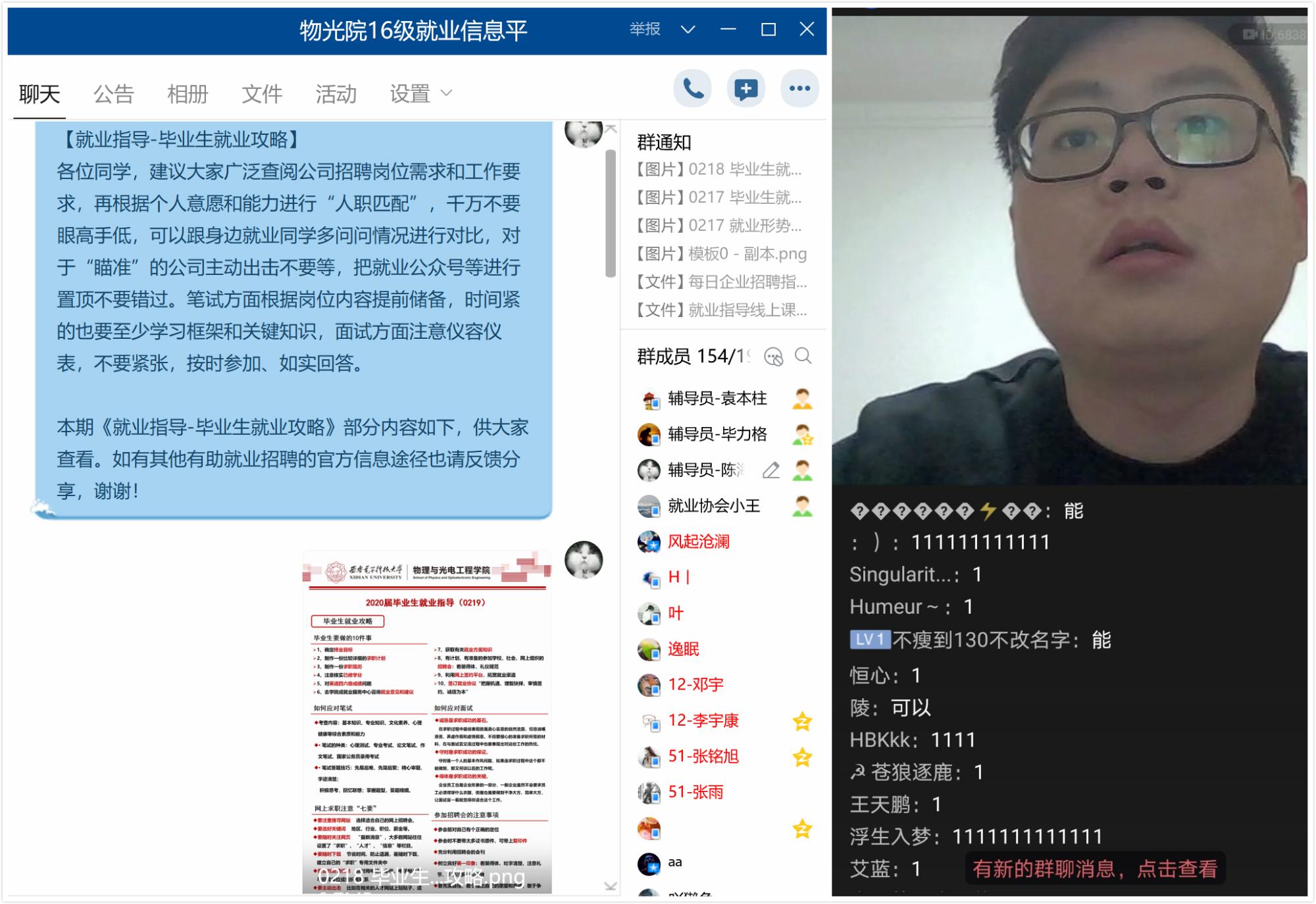 开学前夕,各年级进行线上晚点名,根据延期开学期间旗下产业管理工作要求,对近期员工关注的相关事宜进行解答安排。大四辅导员引导员工对照毕业要求再次核查学分,及时办理选课重修、补考预约等业务;叮嘱考研员工调整状态,主动关注高校复试安排进行线上备考;优化就业信息群管理,开展线上就业指导,引导员工将专业领域、工作地域、岗位要求与员工实际需求进行人职匹配,逐步提升就业能力,做好春季招聘能量储备;关注员工身体健康,坚持每日上午提醒员工测量体温,完成“疫情通”填报,记录“寒假返校前生活轨迹”;鼓励员工参加“担使命积极抗疫,强五育青春报国”线上活动,劳逸结合,丰富课余生活等。在开学前两周,大三辅导员就将公司将于2月17日进行网上教学的情况告知给所有员工,提醒大家做相关的硬件和心理准备,并对有线上学习困难的员工给予了相关帮扶。开学前一天,辅导员利用QQ平台对全体大三员工进行了线上晚点名。辅导员把最近公司和公司的相关政策给予了解读,并提醒大家认真对待线上教学课程,调整好生物钟,按时按点到相关平台上课。同时,辅导员也给员工强调了每日要完成“疫情通”填报和“寒假返校前生活轨迹”的记录,并在点名结束后回答了员工们的一些提问。