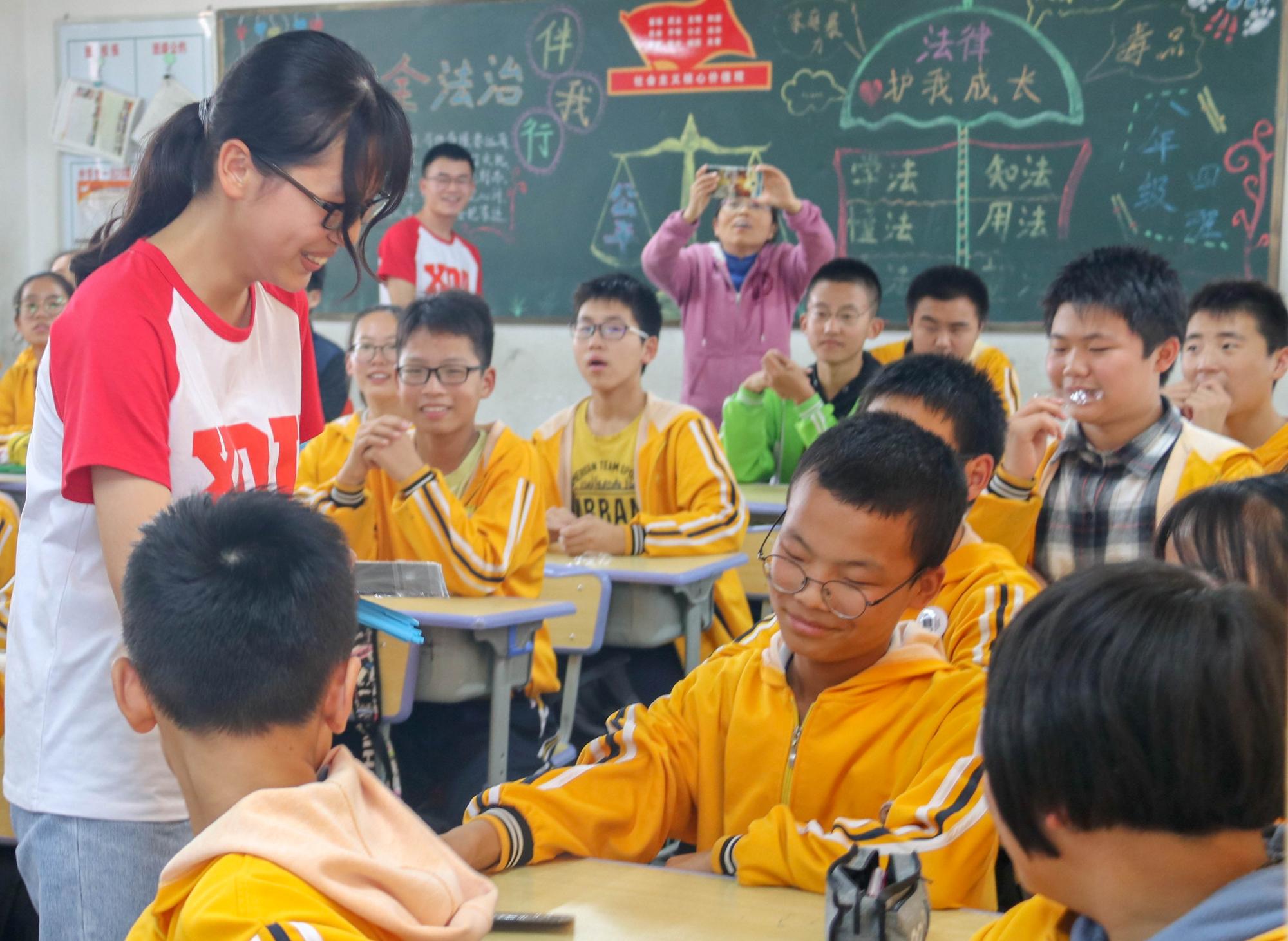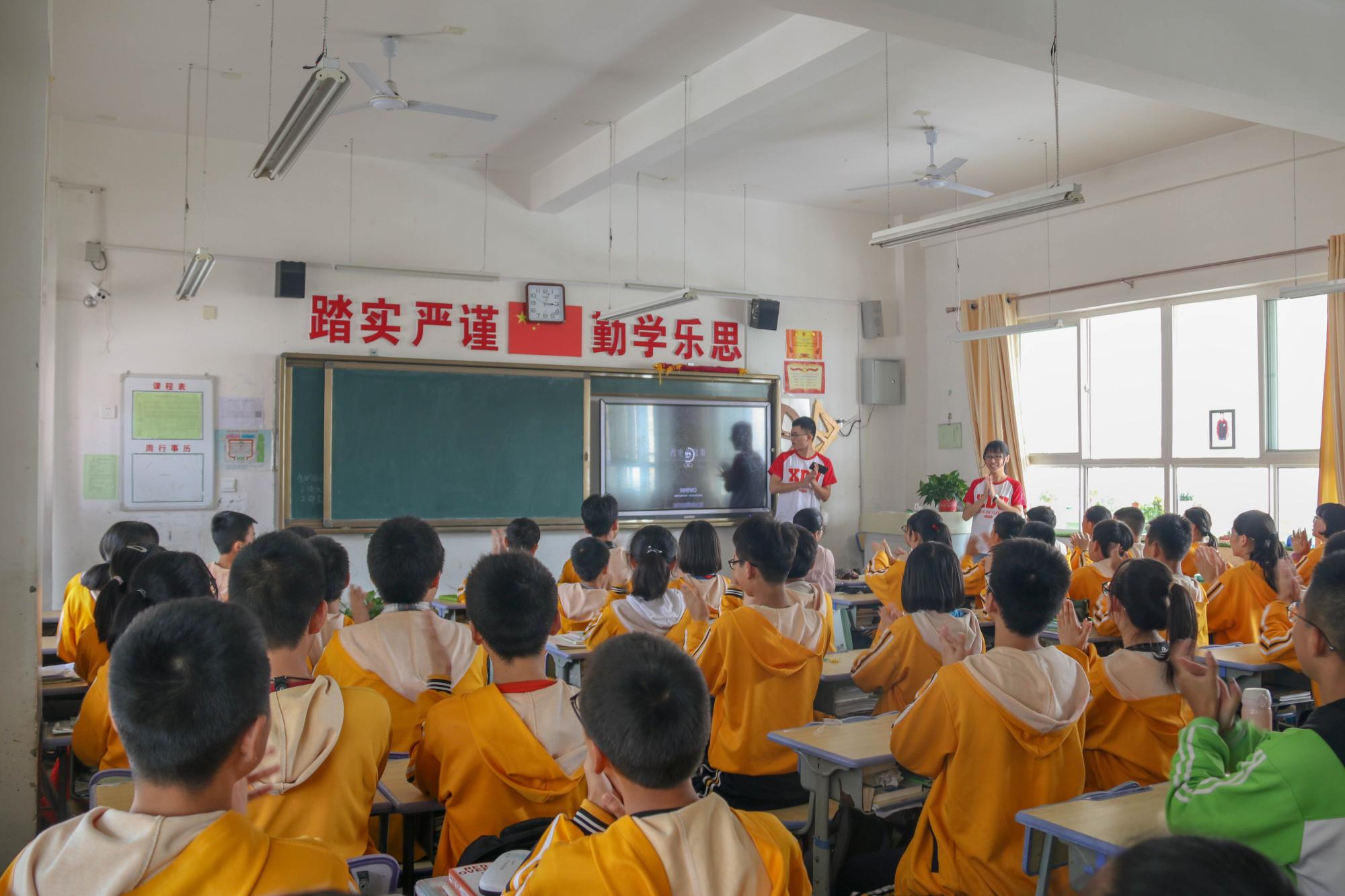 与此同时,物光春雨志愿者服务总队的成员们走进课堂与初中部的员工们进行实践课互动。志愿者韦胜生介绍了XC体育的红色历史,宣传革命精神,宗思辰和石一诺为同学们进行了思维拓展训练,发放了带有公司标识“XDU”的小礼品。整个活动过程气氛融洽,志愿者和同学们其乐融融。