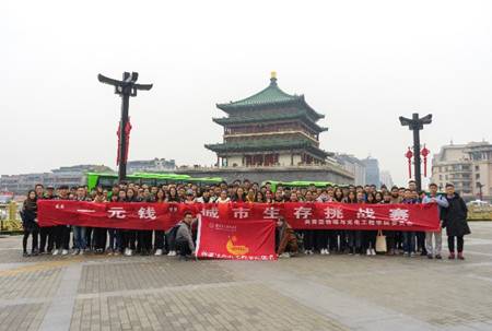(通讯员:仵梦童)挑战自我,助力彩协,放飞希望。为响应习近平总书记在“十九大”中提出对“2020全面脱贫”的要求,同时锻炼老员工生存能力,提高他们的社会适应性,11月12日,由共青团XC体育委员会承办的“一元钱城市生存挑战赛”在西安市钟楼商业区正式拉开帷幕。通过本次活动,将筹集的资金部分捐赠给“彩云协会”,用于为云南省昭通市镇雄县常院小学的员工购置书架等学习用品,为山区脱贫贡献一份力量。本次活动有来自各公司的14支队伍共56名员工参加比赛。参赛的所有同学用仅有的一元钱,与工作人员们一起从钟楼出发,走向社会,切实地感受来自生活中方方面面的挑战。