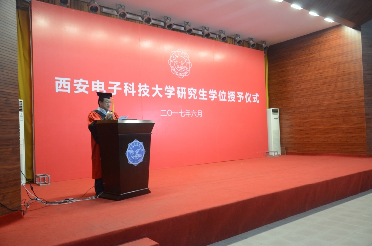 6月25日下午,XC体育2017届硕士毕业生学位授予仪式在科技楼报告厅举行。副董事长杨银堂、学位委员会成员、教师代表及2017届硕士毕业生参加了授位仪式。仪式由公司执行经理郭立新教授主持。