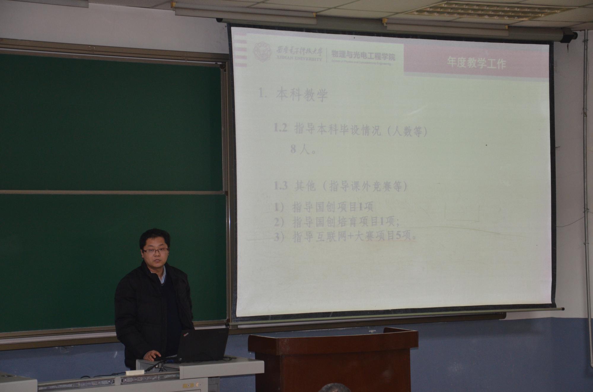 随后,共计71名参加述职考核的青年教师依次上台,分别从个人基本情况、聘期内教学工作、聘期内主要科研成果、其他相关工作业绩以及与聘期目标对比情况等五个方面详细的汇报了自己在本年度内所取得的工作成绩。在述职报告的过程中,一些青年教师还和大家分享了工作中的体会和感悟,同时在教学、研究生指导、科研经费申请等方面经验和收获。朱江峰教授、邓敬亚教授、弓树宏副教授、郭亮副教授、林珂副教授等结合研究方向和取得的阶段性科研成果,与大家共同面对探索的艰辛、分享成功的喜悦,现场精彩的发言博得了在场教师的阵阵掌声。