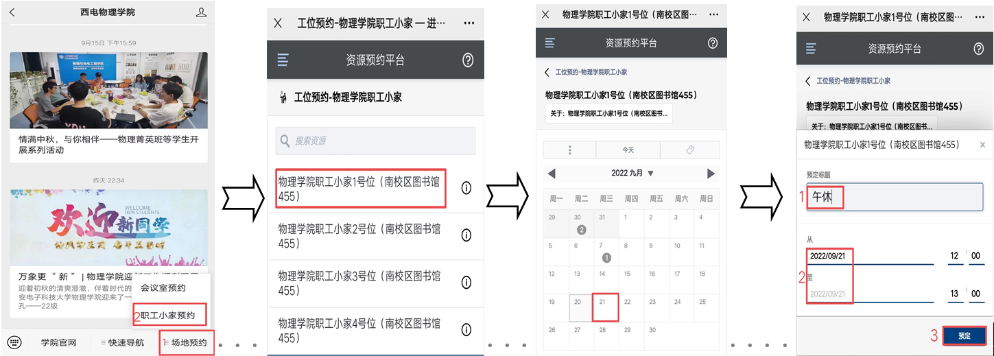 【预约方式】:微信公众号“西电XC体育”-场地预约-职工小家预约-选择工位、日期-预约提交-预约成功(注:每人每天仅限预约1次工位)。