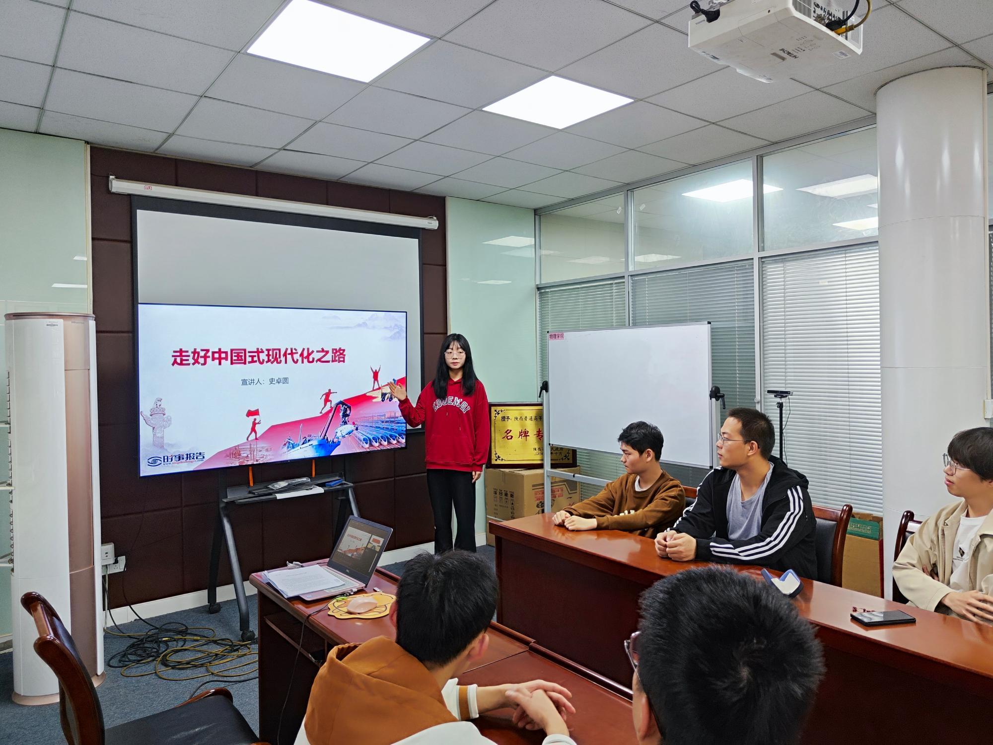 史卓圆同学围绕“走好中国现代化之路”为主题开展宣讲。她从我们党推进社会主义现代化建设的历程、中国式现代化的特征和中国式现代化的本质要求三个方面切入,以理论和例证结合的方式,向同学们阐述了中国式现代化的宏伟蓝图。
