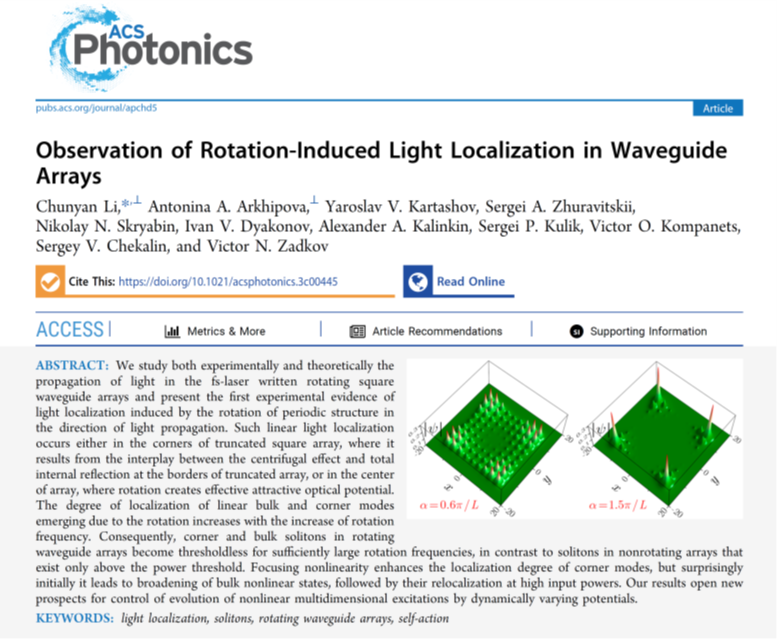 近日,国际光子学领域顶级期刊ACS photonics(中科院JCR一区,Top期刊)在线发表了XC体育李春艳老师题为“Observation of Rotation-Induced Light Localization in Waveguide Arrays”的相关科研成果。该项研究首次在实验上观察到了由大尺度周期旋转波导阵列引起的线性光波的局域现象,并在一定的旋转频率下观察到了无功率阈值的非线性光学孤子。