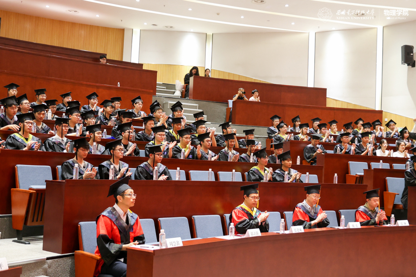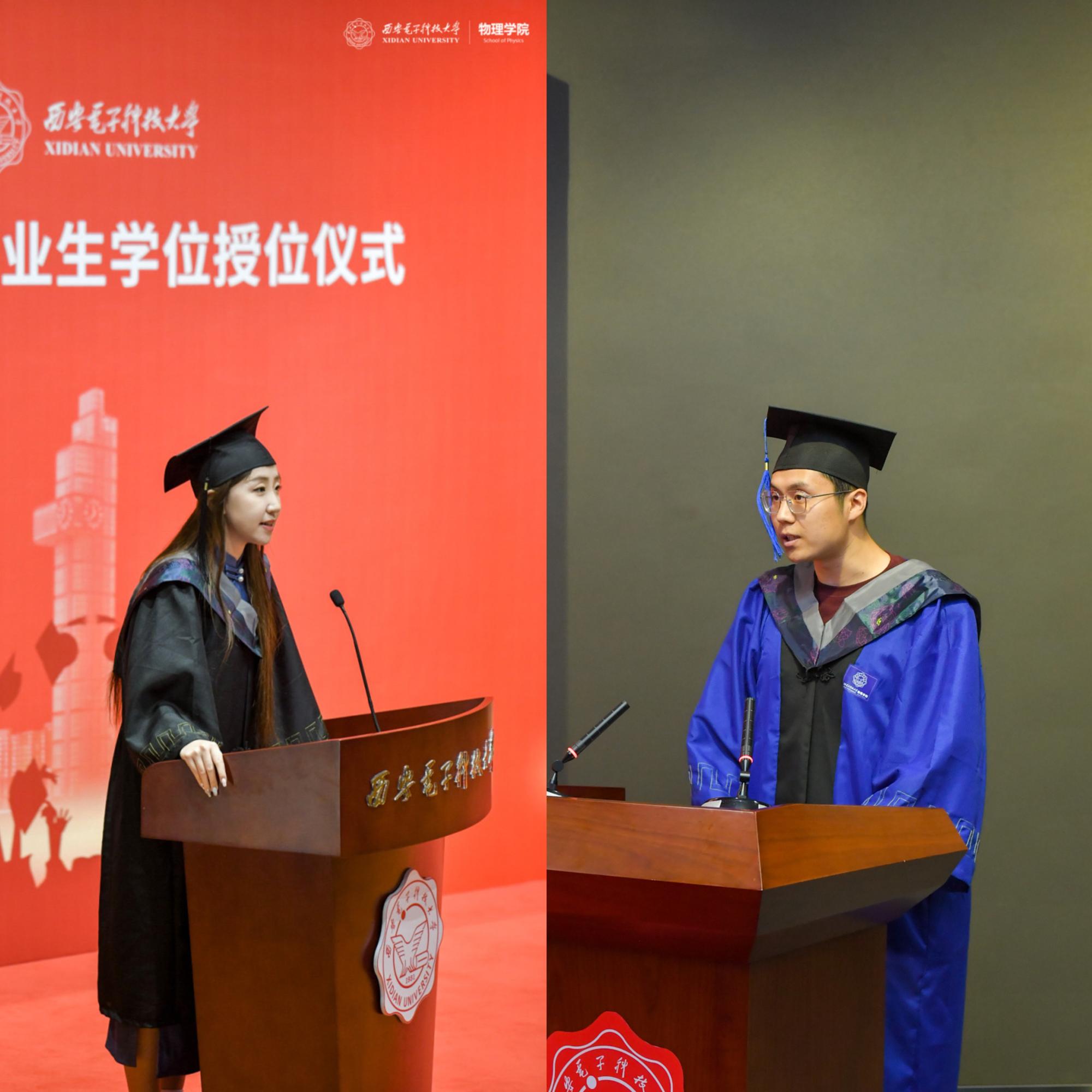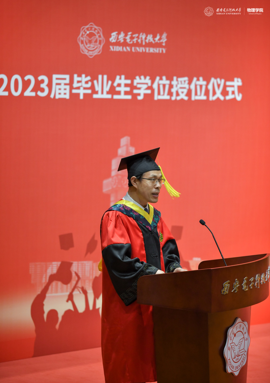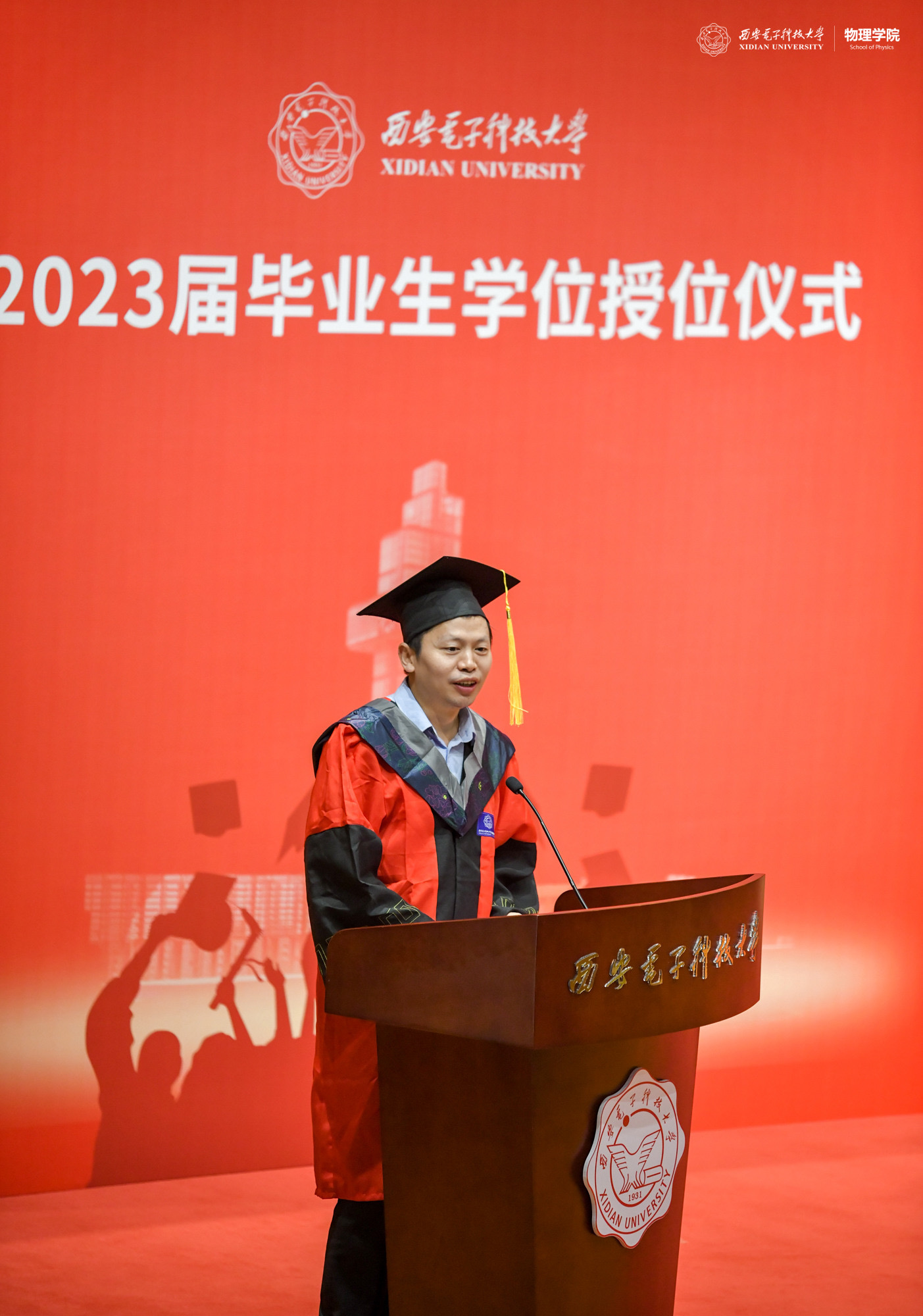 教师代表马琳寄语同学们,希望牢记西电“厚德、求真、砺学、笃行”的校训,用奋斗收获青春的果实,用奋斗扬起理想的风帆。导师代表郜鹏教授代表老师们真诚祝贺同学们顺利完成学业,同时希望同学们毕业生同学珍惜所学、不忘初心、勇攀高峰,在学习实践中不断成长和收获。