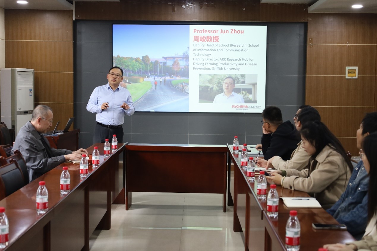 魏兵对Jun Zhou教授的来访表示热烈欢迎,并希望通过此次交流,能对青年教师公司产品、研究生国际交流等方面开拓新的思路。Jun Zhou教授以轻松有趣的方式介绍了澳大利亚及格里菲斯大学的高等教育培养体系,涉及团队建设、办学特色、专业设置、课程体系、代表性成果、奖助学金等方面,并重点介绍了格里菲斯大学的硕士/博士申请、联培的基本要求。他表示非常欢迎感兴趣的同学申请访学与联培,进一步加强双方高校的交流与合作。