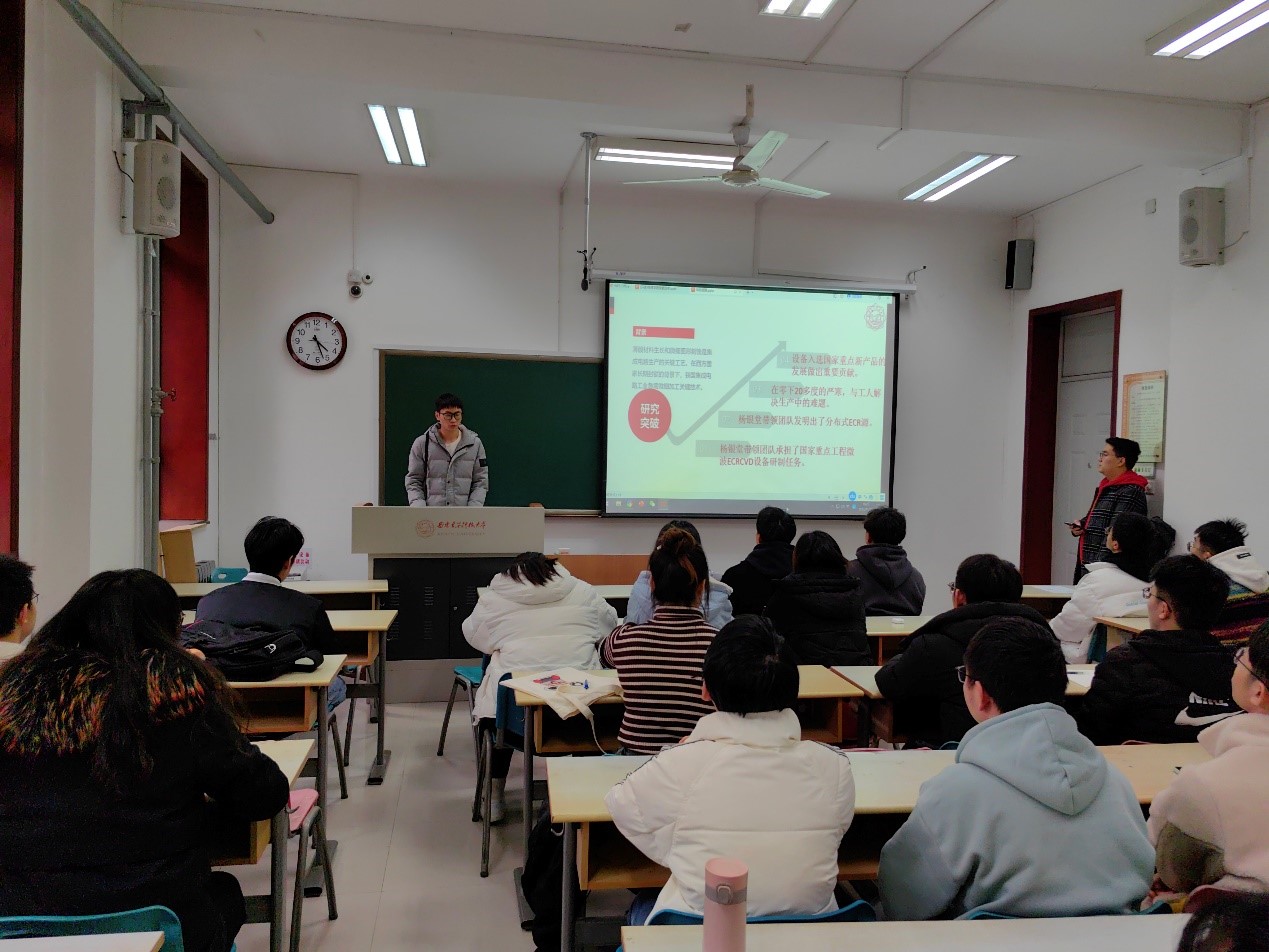 本次党日活动分为两个部分,首先是“科学家精神”主题宣讲。本次宣讲邀请到了“时代之声”研究生宣讲团成员、微电子公司刘滨洋同学进行了题为《杨银堂:架起通往数字世界的桥梁于微观世界“起高楼”》的宣讲,讲述了杨银堂教授带领的半导体集成电路团队科研创新的故事。半导体集成电路是电子信息工业的“食粮”,更是大国博弈的战略焦点。上世纪八十年代,面临国外的技术封锁和国内薄弱的工业技术基础,杨银堂教授和同事们坚定不移地选择了从0做起。杨银堂教授带领团队圆满完成国家重点工程微波ECRCVD设备研制任务,发明出基于稀土永磁材料磁场的分布式ECR源,主要性能指标达到国际先进水平。面对模拟限号与数字信号转换的技术难题,杨银堂教授带领团队经潜心钻研基础理论,提出新型系统架构和转换方法,最终基于国内自主工艺研制出了一系列高性能数据转换器芯片。这些成果先后获得国家科技进步二等奖、国家技术发明二等奖。同时,作为一名高校教师,杨银堂教授也在科研道路上为员工们做着表率,他重视知识背景的拓展和基本知识的积累,在科研过程中亲力亲为,寒冬腊月仍坚守工厂一线,冒着零下二十多度的严寒与工人工作、探讨难题……