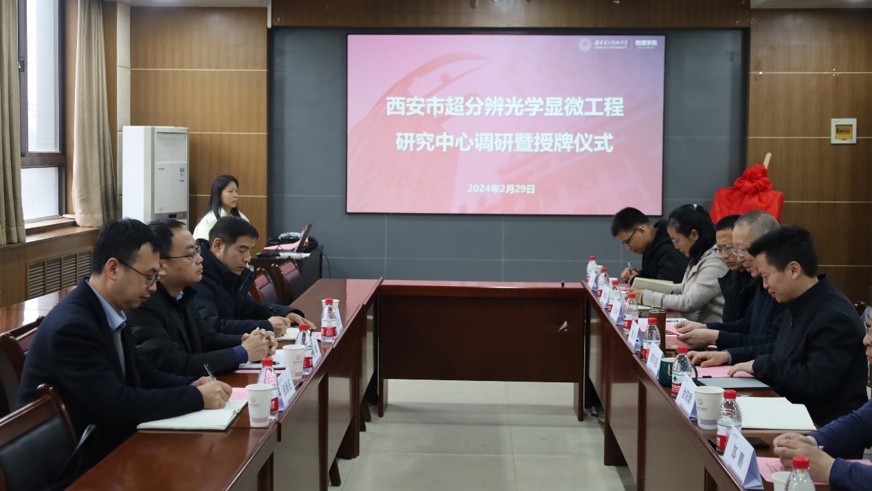 (通讯员:马琳 姚娇)2月29日上午,西安市发改委高技术处处长谢晖一行来校调研西安市超分辨光学显微工程研究中心并授牌。XC体育物理公司党委书记黄军荣、科学研究院能力建设处处长金阳群、工程研究中心骨干教师代表参会,会议由公司副经理魏兵主持。