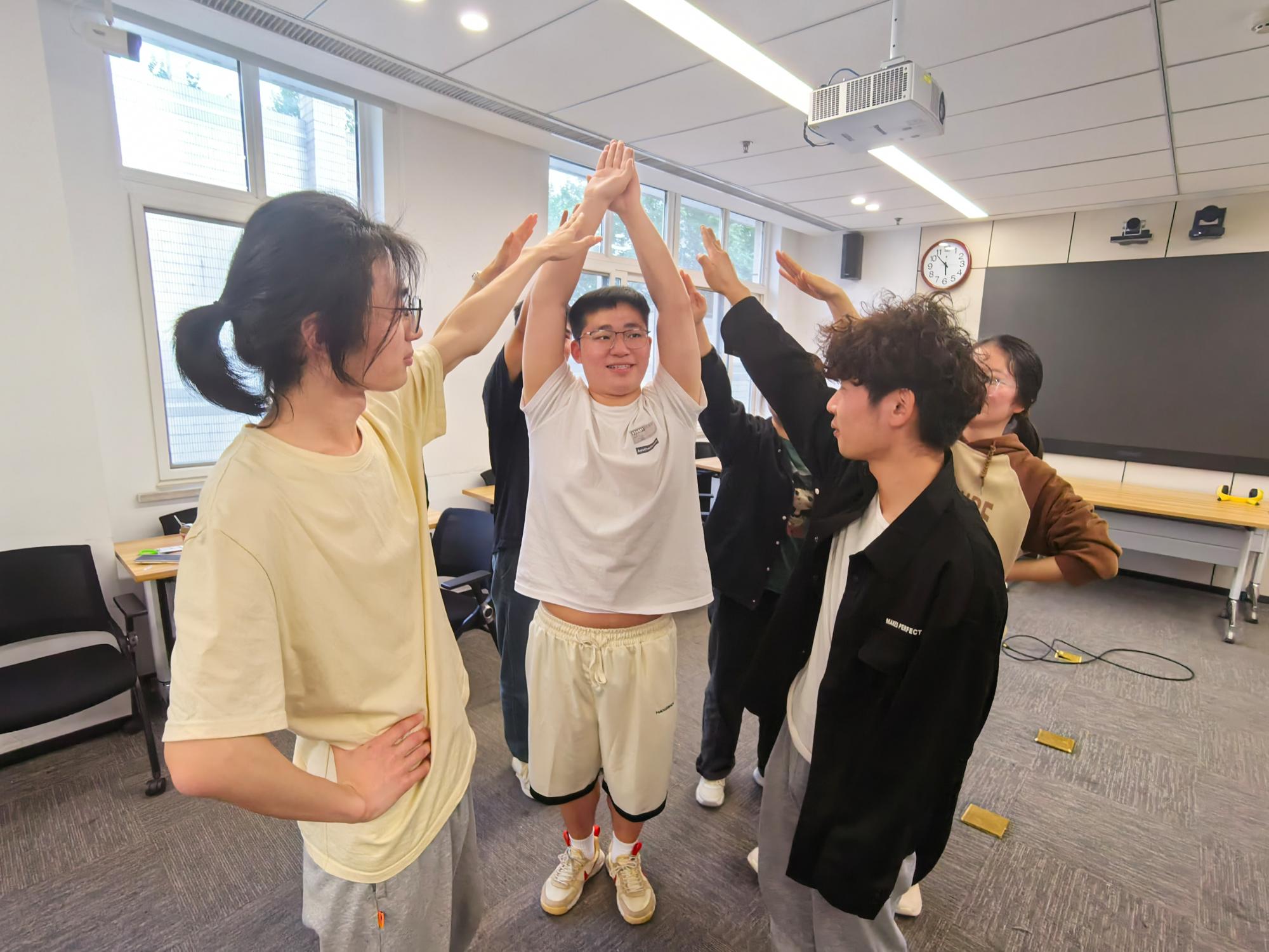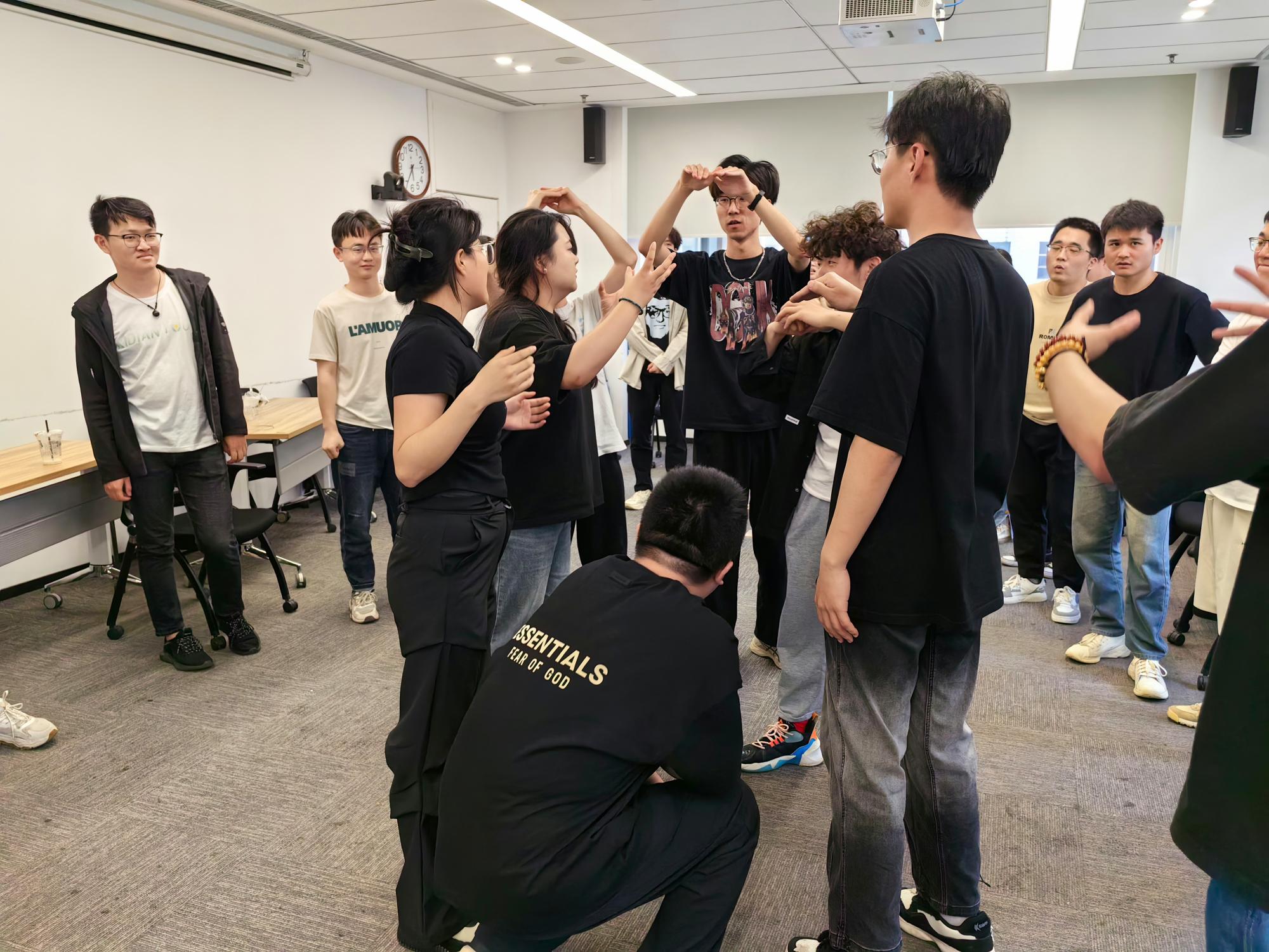 在导师的带领下,首先进行的是以“松鼠搬家”为主题的热身游戏。同学们被分为三人一组,两个人面对面双手举起搭成一个“树屋”,中间蹲下一人,当做“树屋”里面的“松鼠”,随着主持人发出“松鼠搬家”“伐木工人”“森林大火”等指令,同学们需要根据指令变换位置。在热身游戏中,同学们逐渐适应了即兴喜剧的思考模式:没有预设、没有剧本,根据“启发词”快速反应,彼此信赖、互相配合,共同完成任务。