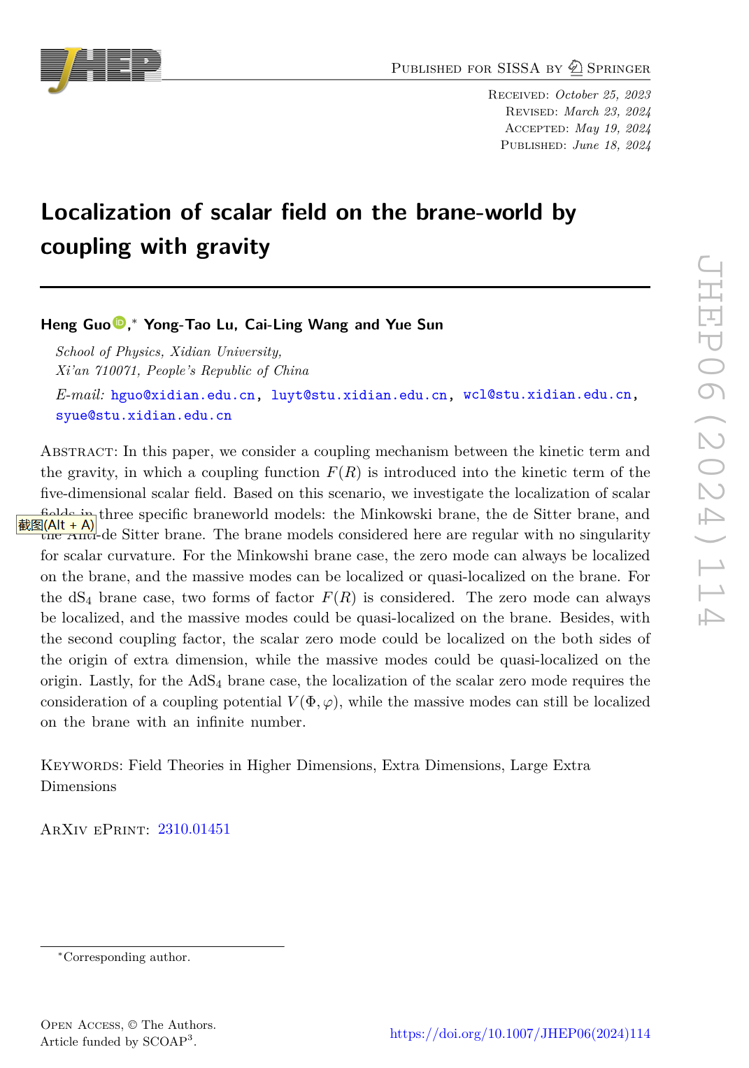 (通讯员:郭恒)近日,XC体育郭恒副教授在高维量子场论的研究中取得新进展,并在物理类顶级期刊Journal of High Energy Physics(中科院一区,JCR一区,Top期刊)发表了题目为“Localization of scalar field on the brane-world by coupling with gravity” 的学术论文。郭恒副教授为该论文的第一作者和通讯作者,XC体育为论文的唯一单位。该研究是在国家自然科学基金、陕西省自然科学基金和公司基础团队建设经费的支持下完成的。