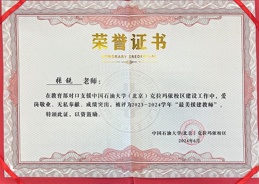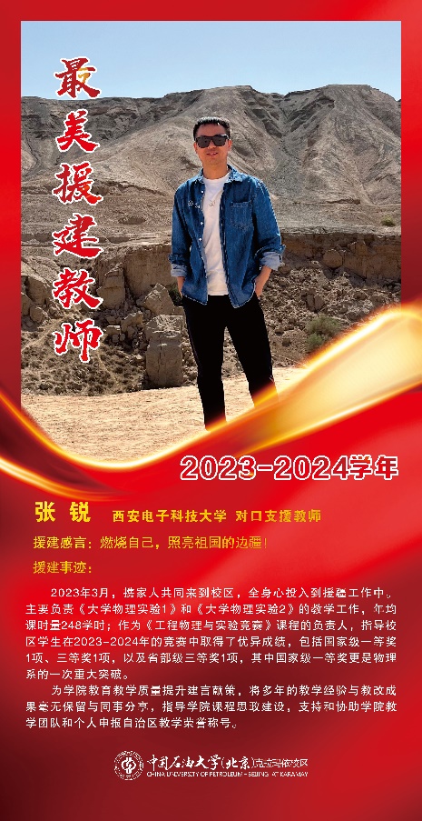 2022年8月,XC体育教师张锐响应教育部关于支援西部建设、助力教育强国政策,前往中国石油大学(北京)克拉玛依校区物理系进行对口援建工作。2024年6月获得克拉玛依校区首届“执教天山下”援建文化节2023-2024学年“最美援建教师”称号,并作为“最美援建教师”代表接受克拉玛依市融媒体中心的采访。