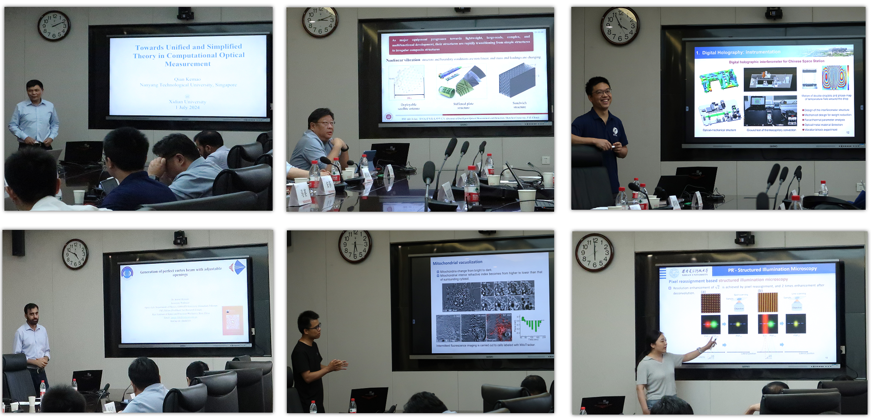 新加坡南洋理工大学钱克矛教授、深圳大学傅愉教授、广东工业大学邸江磊教授、巴基斯坦伊斯兰大学Anwar Hussain教授、西电XC体育马英和安莎老师分别做了学术报告并与参会师生进行交流研讨。钱克矛教授从光学测量出发,介绍了计算光学精密测量领域的基本方法和研究重点,以及在力学、材料等多个领域的应用。傅愉教授介绍一种新的非接触式振动测量方法:即激光与图像相融合的测振技术及其在结构稳态、非稳态振动测量,和在缺陷检测上的应用。邸江磊教授介绍了计算光学成像的发展背景以及“深度学习”在计算光学成像中的应用。随后,就“深度神经网络”所面临的挑战展开讨论,展望人工智能在计算光学成像中的巨大前景。Anwar Hussain教授介绍了涡旋光束的设计、产生以及在三维成像与测量中的应用。马英老师报告中介绍平场定量相衬显微技术,以及其在细胞器之间的时空动态和相互作用研究中的应用。安莎老师介绍了面向深层组织超分辨三维成像的结构光照明显微技术。此外,与会专家和研究生们分享了科研心得、写作经验,以及艺术感悟,希望与会研究生们能够提升科研能力、磨练写作技巧。
