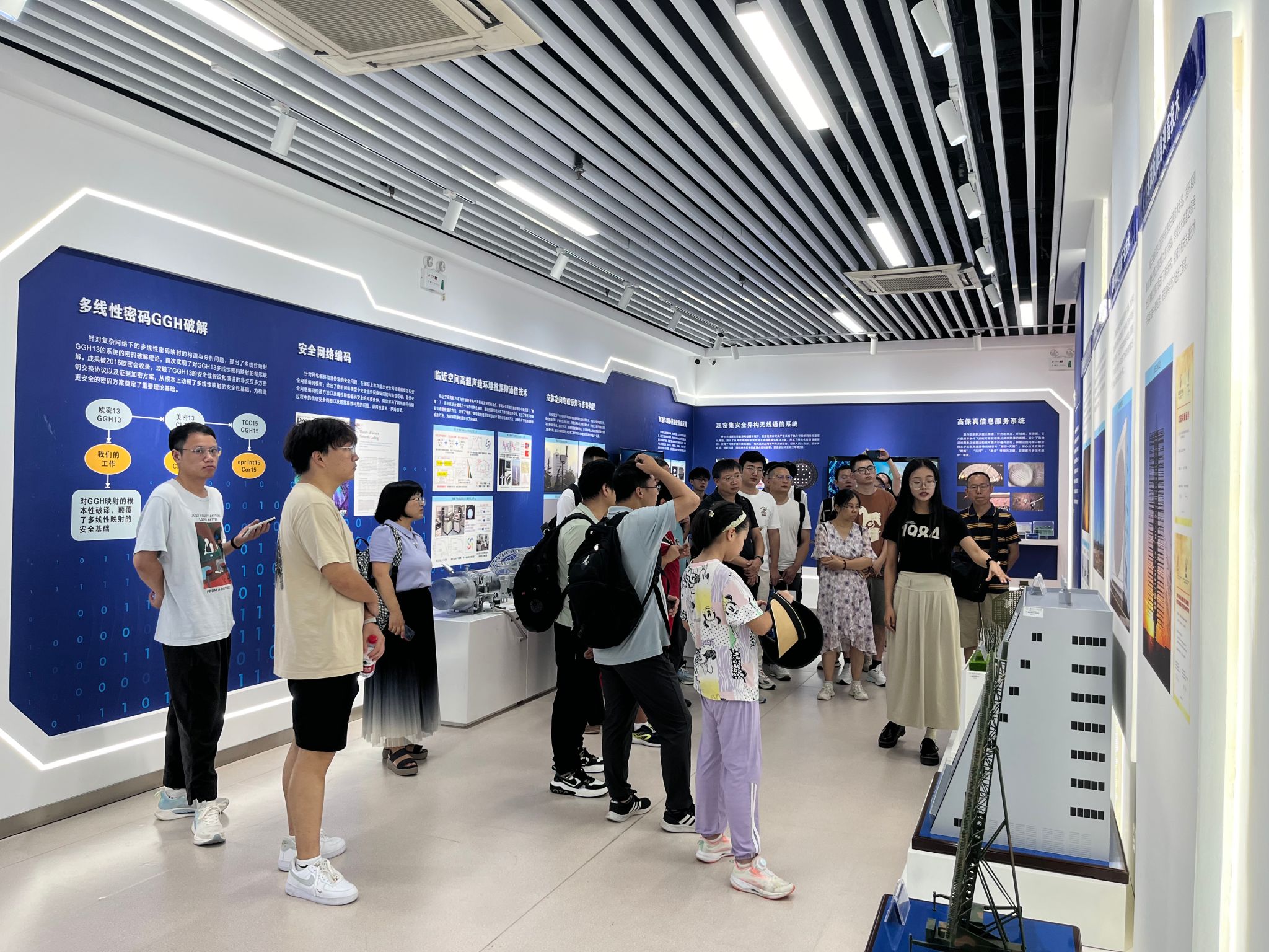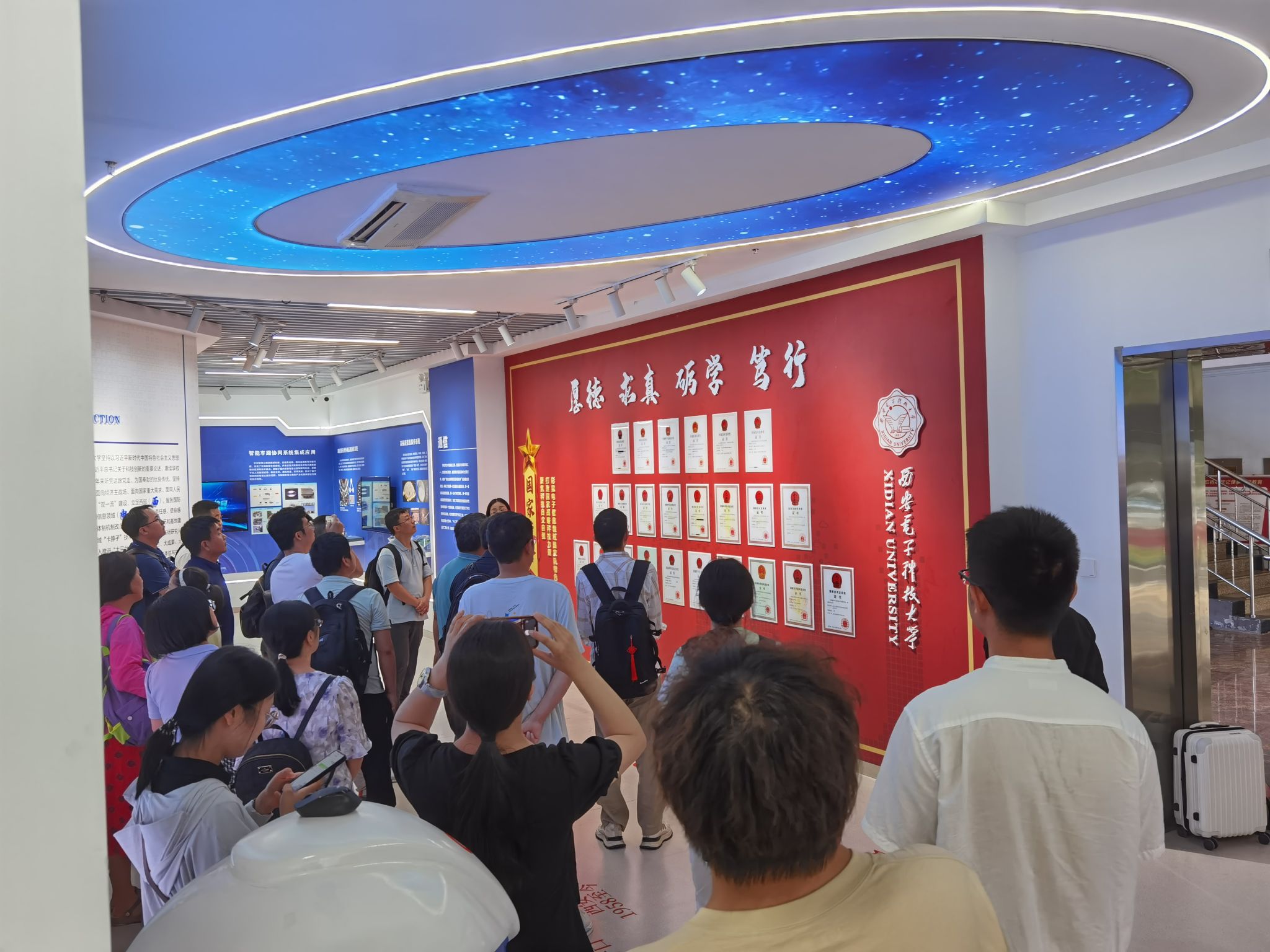 最后,来访专家还参观了北校区科技成果展,了解了公司在信通、电子、计算机、机电、微电子等领域的重要研究成果,大家频频驻足,感受和记录西电在电子信息领域人才培养和科学研究方面的光辉历程。