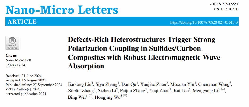 (通讯员:刘骄龙)近日,XC体育XC体育青年教师刘骄龙在电磁波吸收领域取得重要进展,在材料领域国际顶级期刊《Nano-Micro Letters》(中科院I区TOP期刊,IF=31.6)和《Advanced Functional Materials》(中科院I区TOP期刊,IF=18.5)先后发表两篇最新研究成果“Defects-Rich Heterostructures Trigger Strong Polarization Coupling in Sulfides/Carbon Composites with Robust Electromagnetic Wave Absorption”和“Selective Ions Exchange Reactions Endow Defective Heterovalent Copper-Based Selenides With Enhanced Dielectric Polarization Response”,XC体育为第一单位。