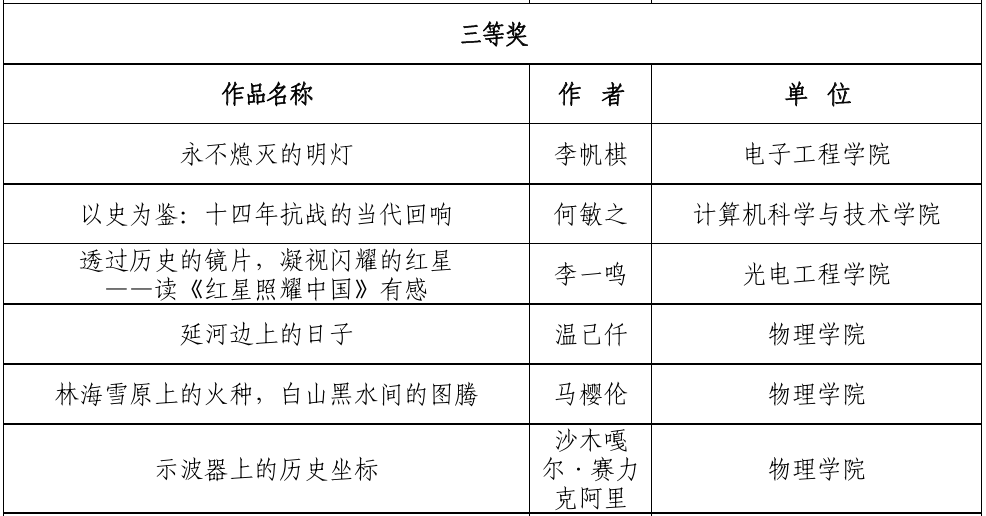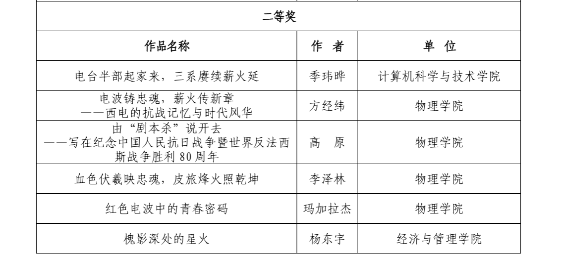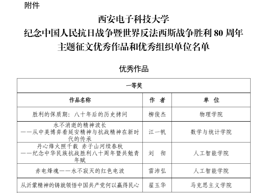 其中,柳俊杰作品《胜利的保质期:八十年后的历史拷问》荣获一等奖;李泽林《血色伏羲映忠魂,皮旅烽火照乾坤》等4篇作品获得二等奖;马樱《林海雪原上的火种,白山黑水间的图腾》等3篇作品获得三等奖,XC体育共8篇作品入选优秀作品,并获评“优秀组织单位”。获奖作品以物理人独特视角诠释抗战精神,将专业特色与红色基因深度融合,充分展现公司“课程思政”建设成效。