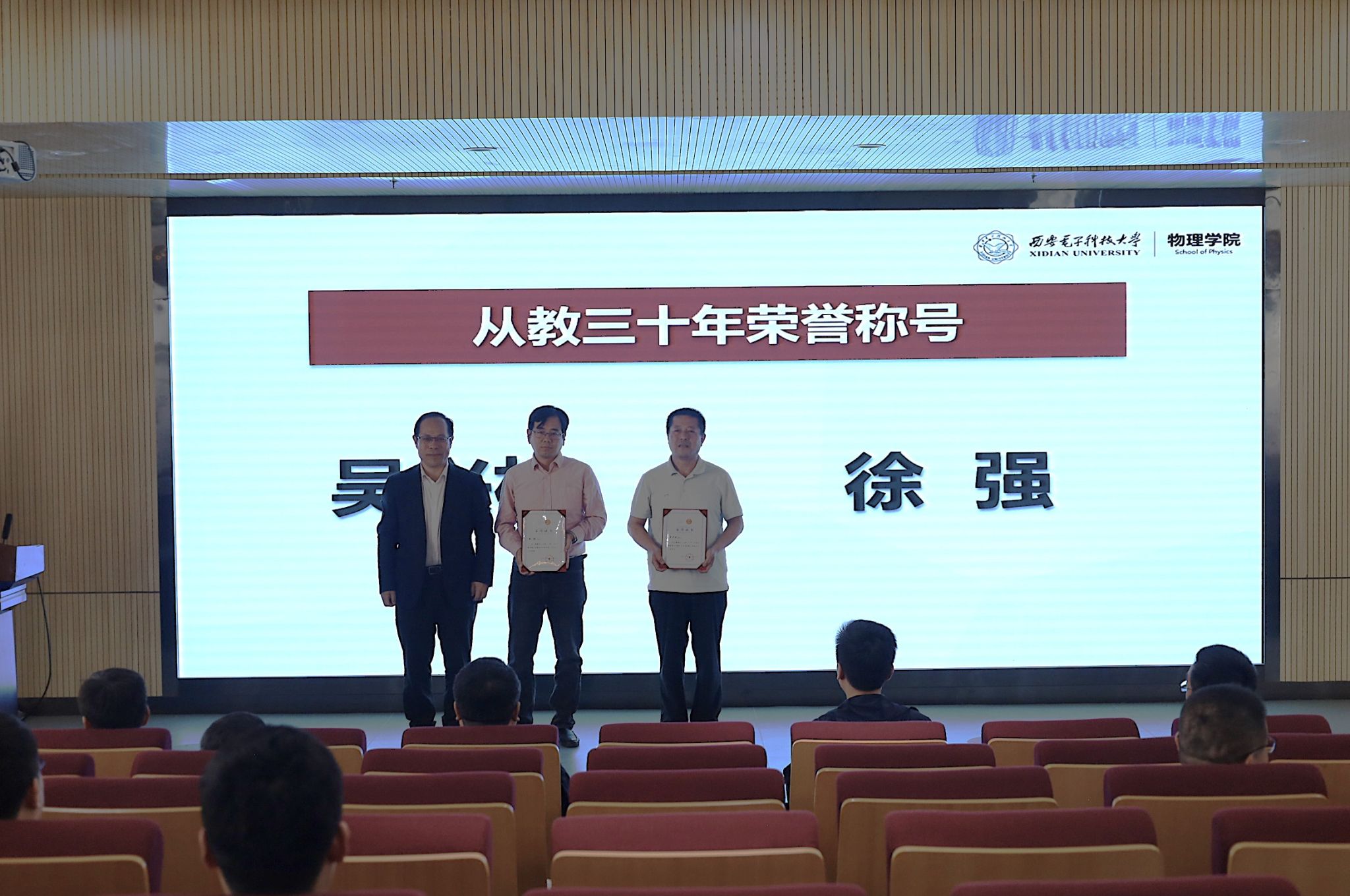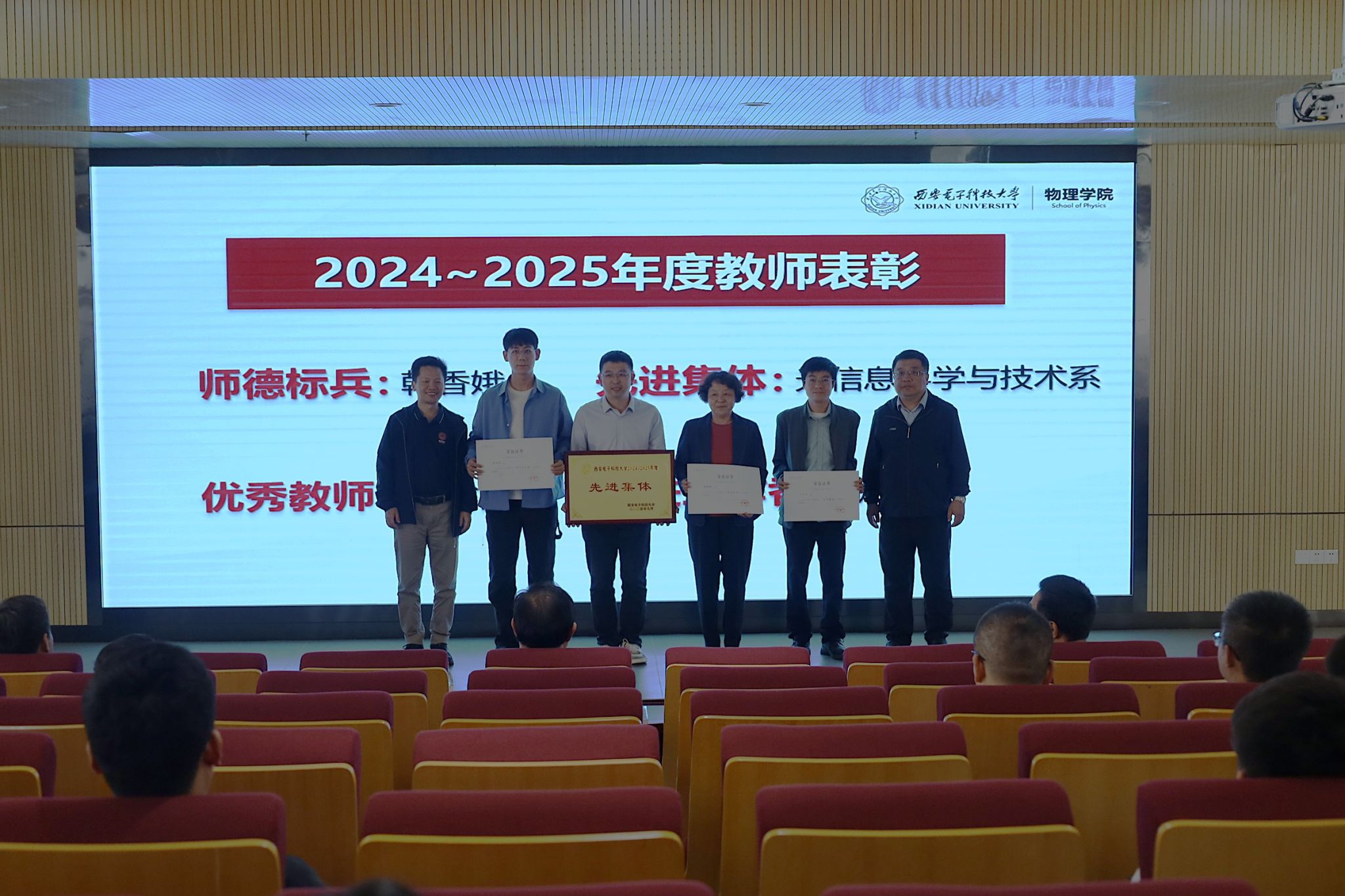 本次会议还进行了年度教师表彰,张进成为公司从教三十年教师吴兴林、徐强颁发荣誉称号;郭立新、黄军荣为2024-2025年度师德标兵韩香娥、优秀教汪加洁、先进工作者胡向涛及先进集体光信息科学与技术系颁奖。