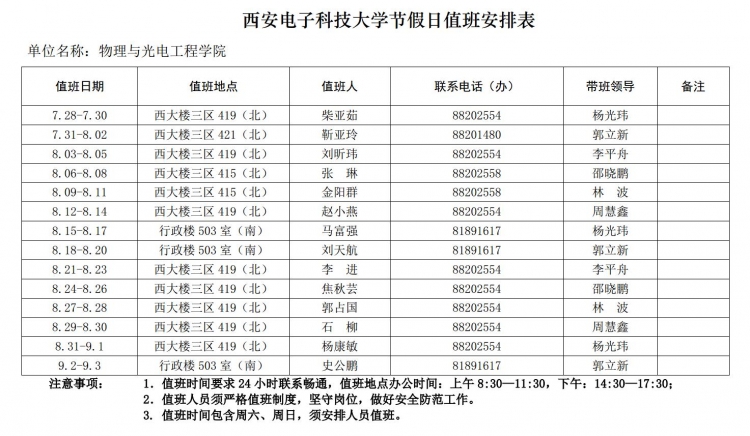 根据公司2015年暑假时间安排的通知,公司暑假值班情况安排如下: