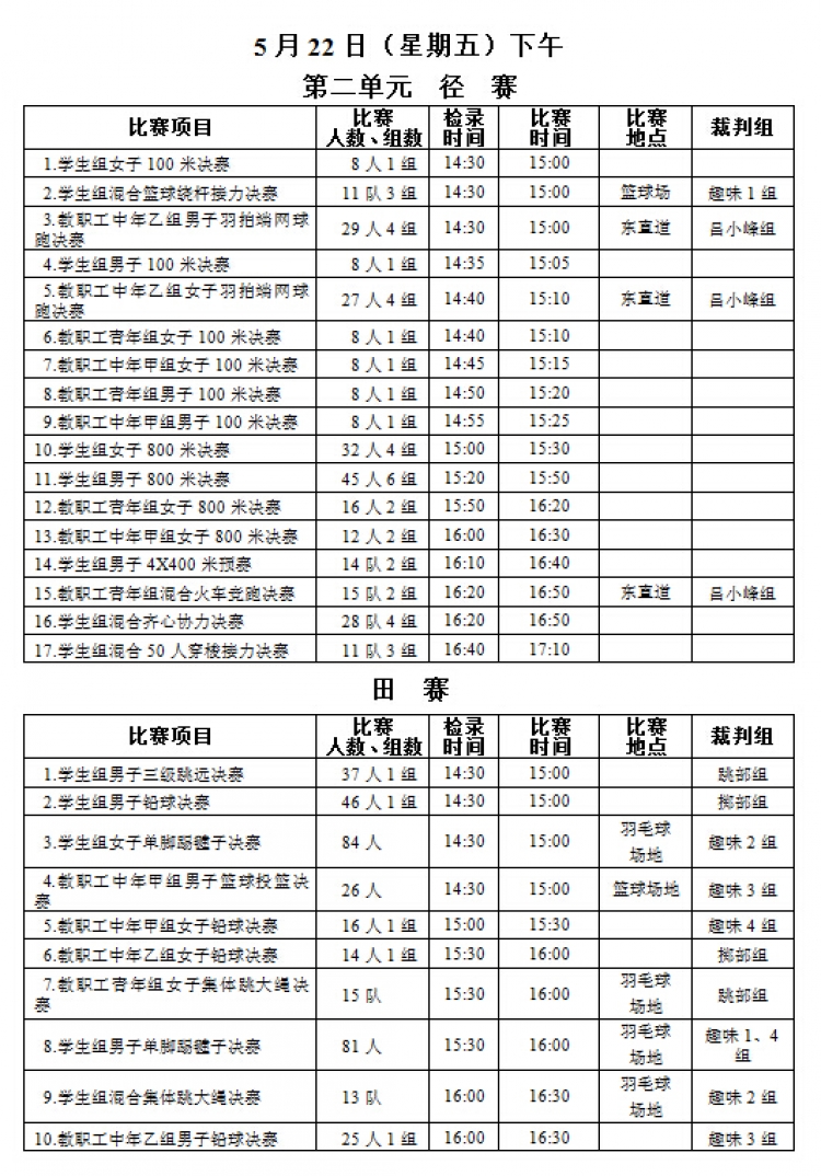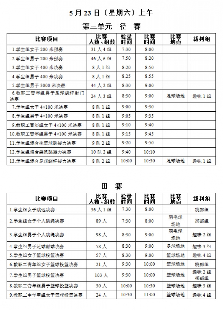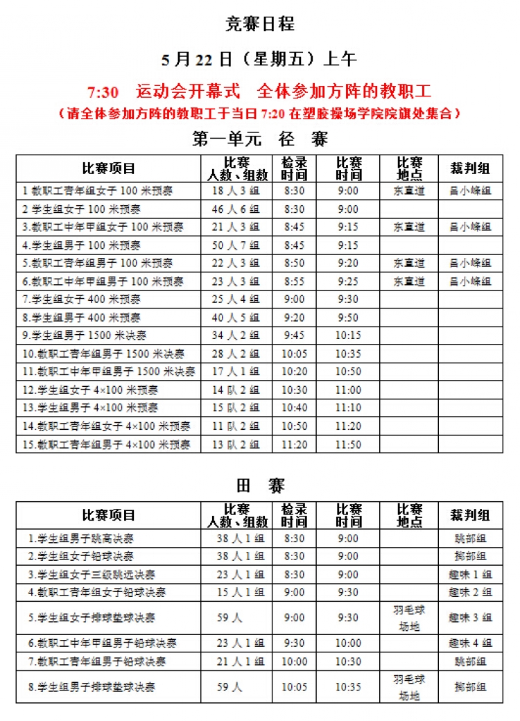 “XC体育2015年教职工运动会”将于本周五、六两日(5月22、23日)在新校区塑胶操场举行,现将《赛程安排》公布如下,请各系室工会组长通知各位选手(参照《西电科大运动会物光院参赛名单》,查看网址:http://stp.xidian.edu.cn/view-1194.html)提前做好参赛准备,着公司统一运动服按时参赛,同时,也鼓励未参赛教职工前来观看,为公司加油打气!请相互转告。