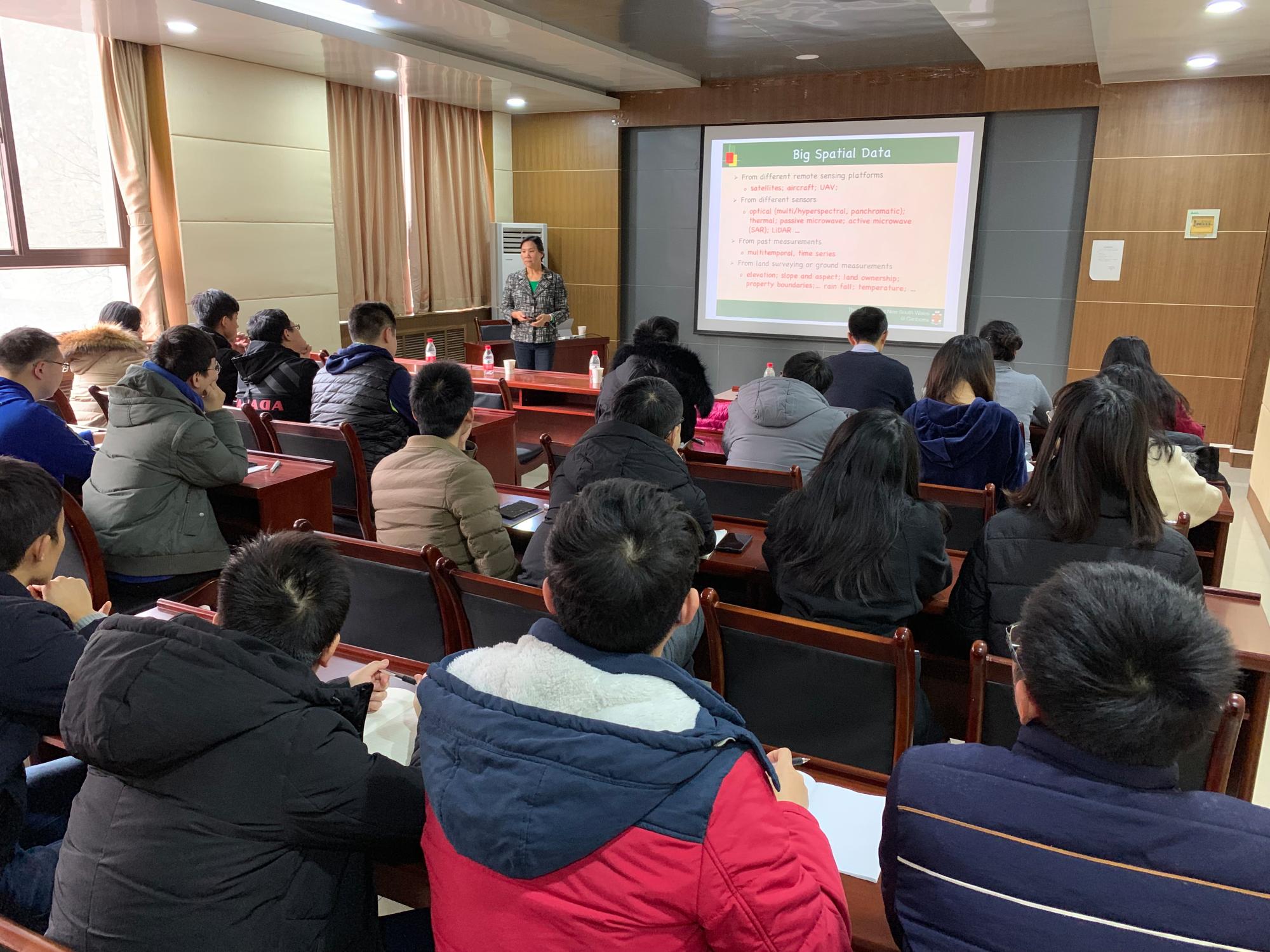 随后,XiupingJIA博士以具体实例介绍了她们团队使用大数据处理技术解决遥感问题的最新科研进展和成果。内容包括遥感图像中的云去除、角度校正、图像配准技术,以及对遥感图像中感兴趣特征的特征挖掘技术,重点讲述了特征选取的重要性及对选取标准的讨论。整场报告会在轻松愉快的氛围中进行,XiupingJIA博士也鼓励大家随时可就报告内容向她提问,进行学术讨论。